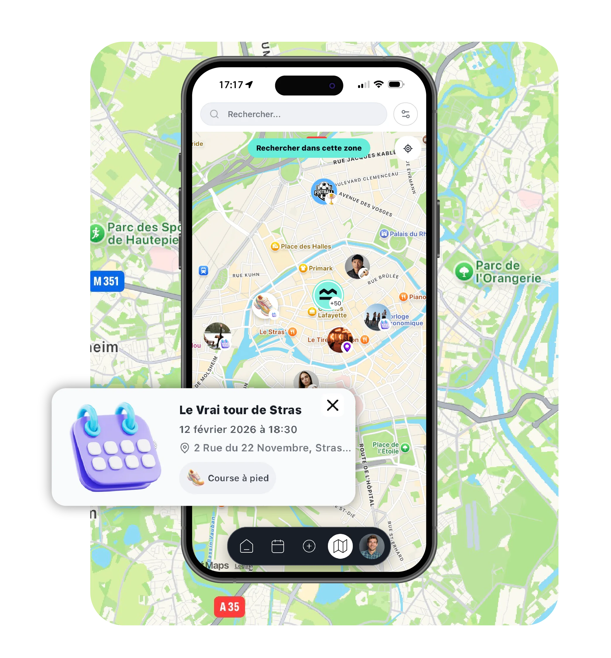 Vous pouvez visualiser les événements proches et voir en un clin d’œil où se passent les activités que vous souhaitez rejoindre. C’est l’outil idéal pour planifier vos sorties sportives, rencontrer d’autres passionnés et profiter pleinement de votre ville.